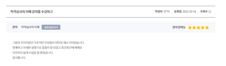 가장 많이들 찾아주시는 적격심사의 이해 교육 후기를 소개하겠습니다.
