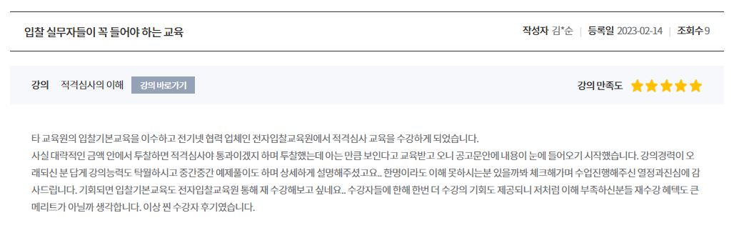 강의 만족도 별 다섯개를 자랑하는 전자입찰교육원!